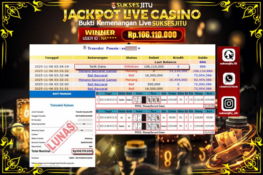 Selamat kepada User id : NA**** Telah berhasil mendapatkan kemenangan besar pada permainan LIVE GAMES BACCARAT kemenangan Sebesar Rp.106.110.000, Setelah mengisi formulir withdraw dengan kurung waktu hanya 5 – 10 menit pihak suksesjitu sudah melakukan transfer kepada pemilik Userid dan dana sudah dapat di cairkan oleh pemenang. Bukti pembayaran yang kami berikan merupakan bukti pembayaran yang SAH / VALID yang langung di dapatkan melaui tanda transfer transaksi dari Bank yang di tuju.