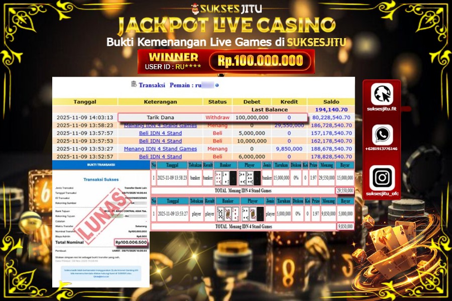 Selamat kepada User id : RU**** Telah berhasil mendapatkan kemenangan besar pada permainan LIVE GAMES IDN 4 STAND GAMES kemenangan Sebesar Rp.100.000.000, Setelah mengisi formulir withdraw dengan kurung waktu hanya 5 – 10 menit pihak suksesjitu sudah melakukan transfer kepada pemilik Userid dan dana sudah dapat di cairkan oleh pemenang. Bukti pembayaran yang kami berikan merupakan bukti pembayaran yang SAH / VALID yang langung di dapatkan melaui tanda transfer transaksi dari Bank yang di tuju.