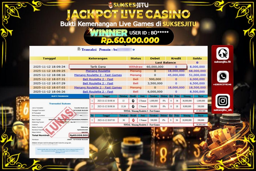 Selamat kepada User id : BO***** Telah berhasil mendapatkan kemenangan besar pada permainan LIVE GAMES ROULATTE 2 kemenangan Sebesar Rp.60.000.000, Setelah mengisi formulir withdraw dengan kurung waktu hanya 5 – 10 menit pihak suksesjitu sudah melakukan transfer kepada pemilik Userid dan dana sudah dapat di cairkan oleh pemenang. Bukti pembayaran yang kami berikan merupakan bukti pembayaran yang SAH / VALID yang langung di dapatkan melaui tanda transfer transaksi dari Bank yang di tuju.