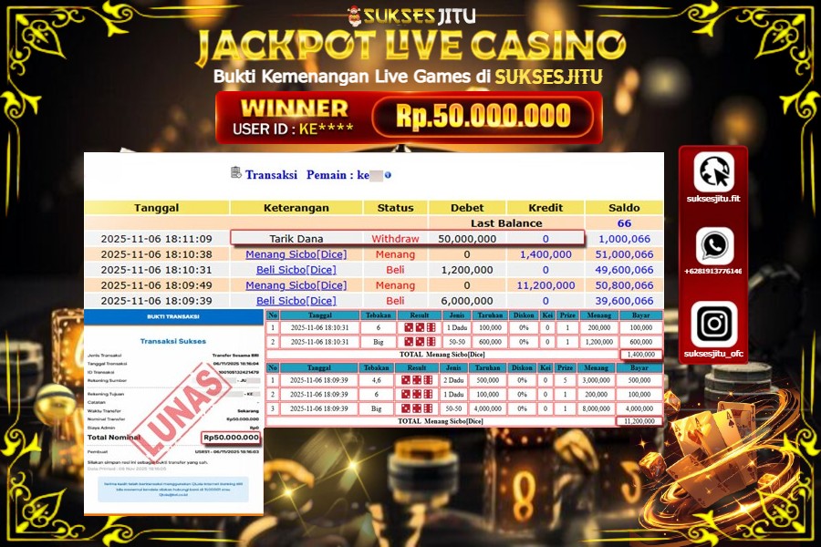 Selamat kepada User id : KE**** Telah berhasil mendapatkan kemenangan besar pada permainan LIVE GAMES SICBO DICE kemenangan Sebesar Rp.50.000.000, Setelah mengisi formulir withdraw dengan kurung waktu hanya 5 – 10 menit pihak suksesjitu sudah melakukan transfer kepada pemilik Userid dan dana sudah dapat di cairkan oleh pemenang. Bukti pembayaran yang kami berikan merupakan bukti pembayaran yang SAH / VALID yang langung di dapatkan melaui tanda transfer transaksi dari Bank yang di tuju.