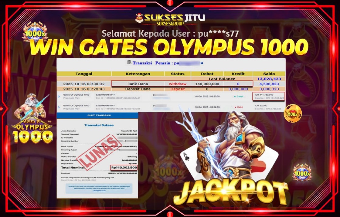 SUKSESJITU JACKPOT SLOT GATES OLYMPUS 1000 Rp.140.000.000,- LUNAS