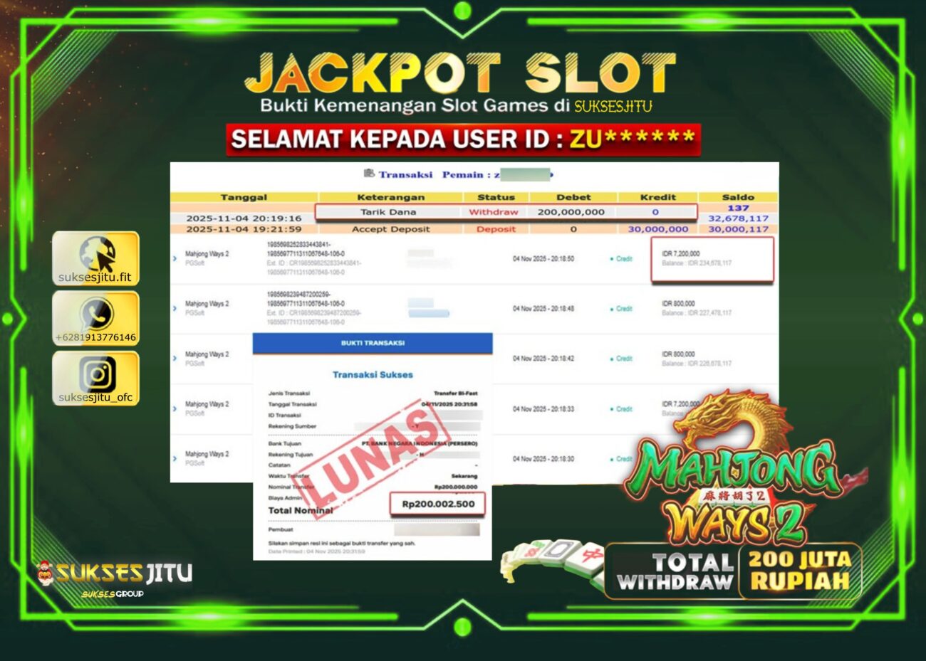 SUKSESJITU JACKPOT SLOT MAHJONG WAYS 2 Rp.200.000.000,- LUNAS