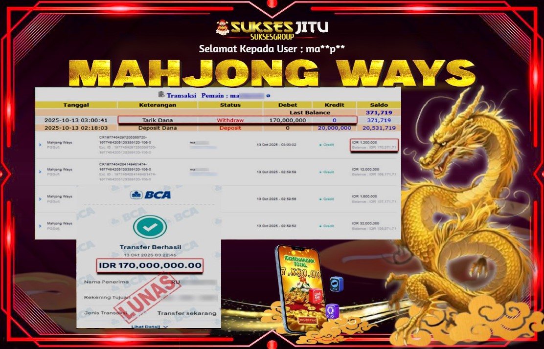 Selamat kepada User id : MA**P** Telah berhasil mendapatkan kemenangan besar pada permainan SLOT MAHJONG WAYS kemenangan Sebesar Rp.170.000.000, Setelah mengisi formulir withdraw dengan kurung waktu hanya 5 – 10 menit pihak suksesjitu sudah melakukan transfer kepada pemilik Userid dan dana sudah dapat di cairkan oleh pemenang. Bukti pembayaran yang kami berikan merupakan bukti pembayaran yang SAH / VALID yang langung di dapatkan melaui tanda transfer transaksi dari Bank yang di tuju.
