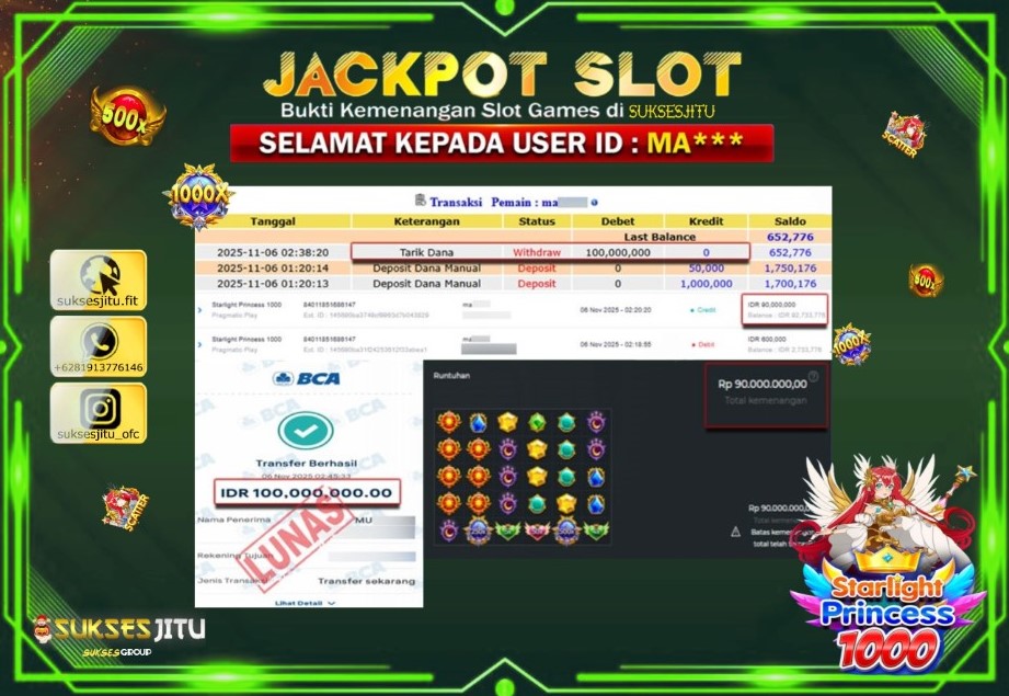 Selamat kepada User id : MA*** Telah berhasil mendapatkan kemenangan besar pada permainan SLOT PRINCESS SUPER SCATTER kemenangan Sebesar Rp.100.000.000, Setelah mengisi formulir withdraw dengan kurung waktu hanya 5 – 10 menit pihak suksesjitu sudah melakukan transfer kepada pemilik Userid dan dana sudah dapat di cairkan oleh pemenang. Bukti pembayaran yang kami berikan merupakan bukti pembayaran yang SAH / VALID yang langung di dapatkan melaui tanda transfer transaksi dari Bank yang di tuju.