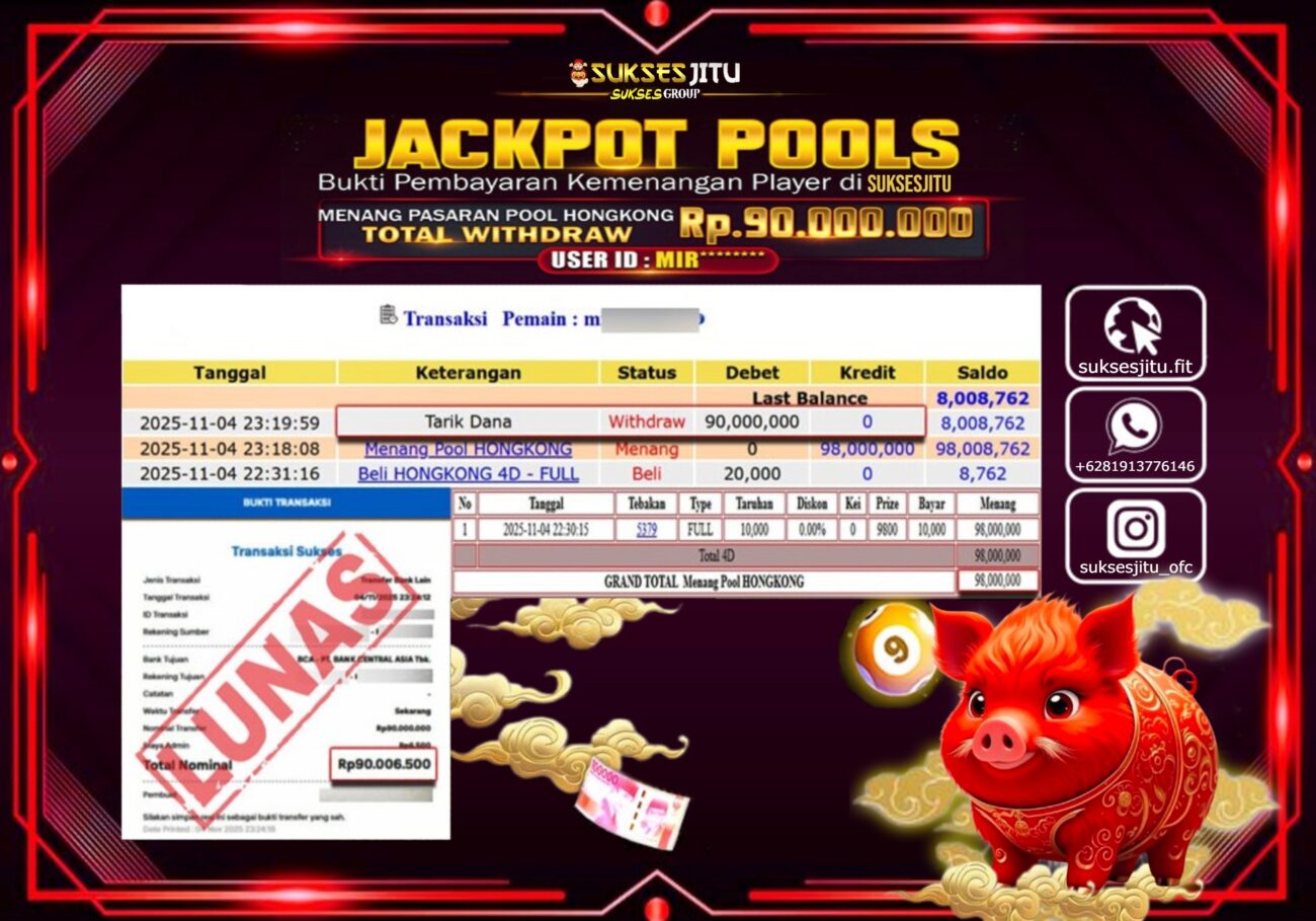 Selamat kepada User id : MIR******** Telah berhasil mendapatkan kemenangan besar pada permainan TOGEL PASARAN HONGKONG LOTTO kemenangan Sebesar Rp.90.000.000, Setelah mengisi formulir withdraw dengan kurung waktu hanya 5 – 10 menit pihak suksesjitu sudah melakukan transfer kepada pemilik Userid dan dana sudah dapat di cairkan oleh pemenang. Bukti pembayaran yang kami berikan merupakan bukti pembayaran yang SAH / VALID yang langung di dapatkan melaui tanda transfer transaksi dari Bank yang di tuju.