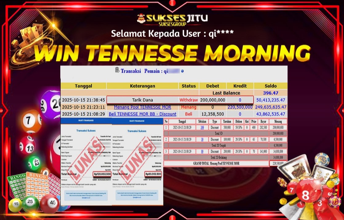 SUKSESJITU JACKPOT TOGEL PASARAN TENNESSE MORNING Rp.200.000.000,- LUNAS