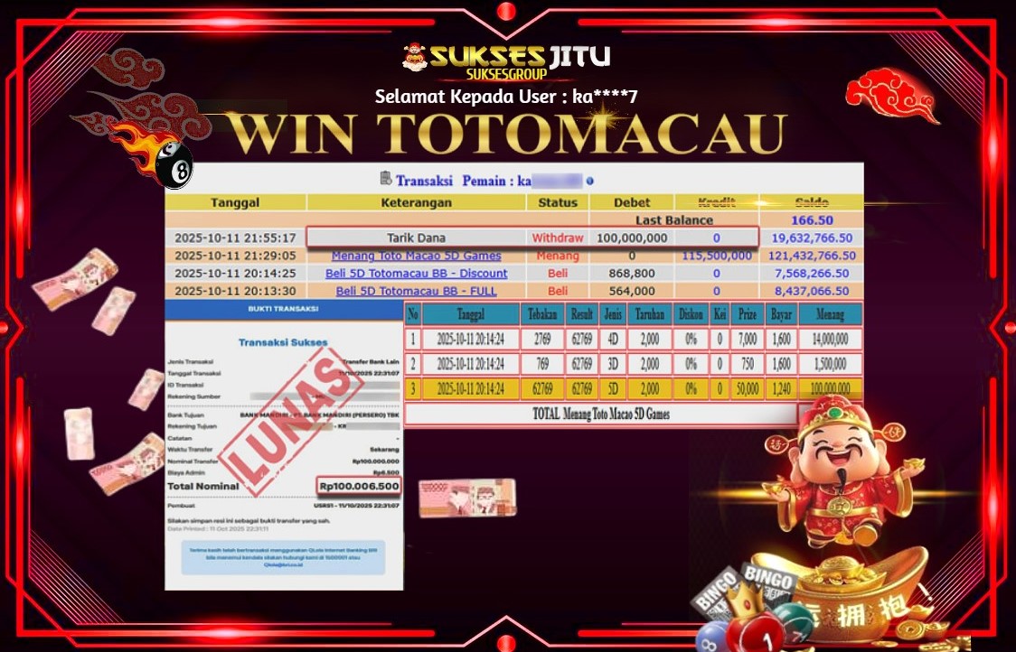SUKSESJITU JACKPOT TOGEL TOTO MACAU Rp.115.500.000.,- LUNAS